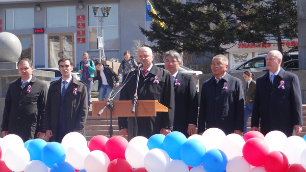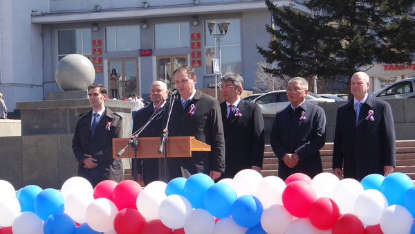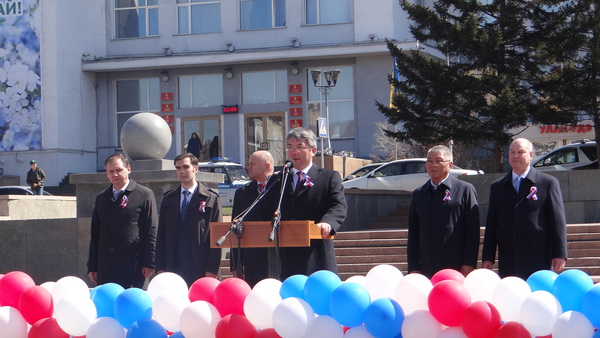 С приветственными словами к собравшимся на митинге выступили Глава Республики Бурятия Алексей Цыденов, Председатель Народного Хурала Республики Бурятии Цырен Доржиев, мэр города Улан-Удэ Александр Голков, Главный федеральный инспектор по РБ Сергей Ромахин, Председатель ООП РБ Дмитрий Колмаков, представитель ОНФ в РБ Евгений Нолев.