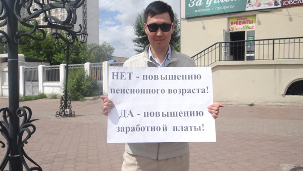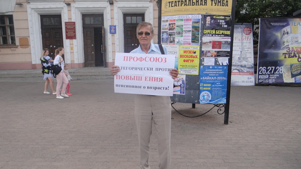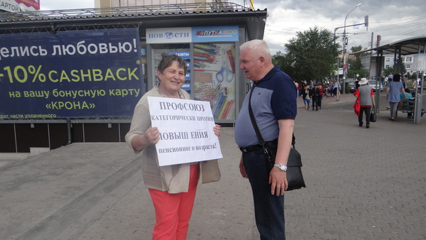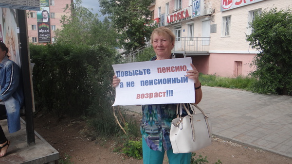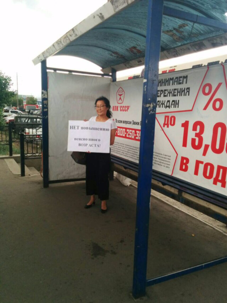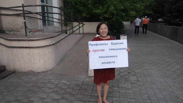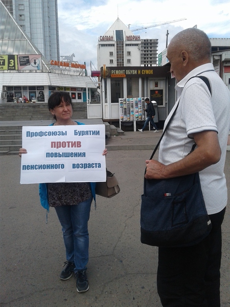 Сегодня в Улан-Удэ прошли одиночные пикеты против повышения пенсионного возраста. Их организаторами являются профсоюзы Бурятии. Пикеты состоялись в 22 оживлённых местах города – на остановках общественного транспорта рядом с популярными торговыми центрами от площади Советов до МФЦ и «Мегадома».