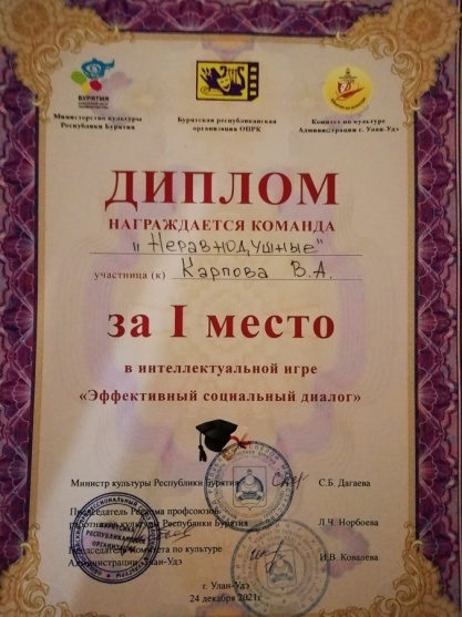 По завершению учебы состоялась интеллектуальная игра «Эффективный социальный диалог».Его учредителями явились Реском, Министерство культуры РБ и Комитет по культуре Администрации г.Улан-Удэ в соответствии с планом мероприятий по выполнению Отраслевого соглашения на 2021-2023 гг. Всего в турнире приняли участие 4 команды, сформированные из членов профсоюза по видам учреждений: библиотечные, культурно-досуговые, театрально-зрелищные и образовательные учреждения в сфере культуры.