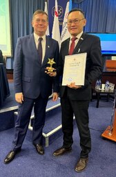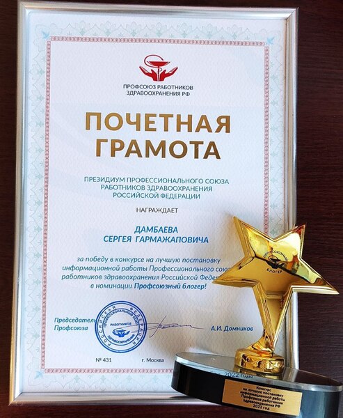 2 ноября 2022 года в Москве на V Пленуме ЦК Профсоюза из рук председателя Анатолия Домникова свою заслуженную награду получил заместитель председателя Бурятской республиканской организации Профсоюза Сергей Дамбаев, который победил в конкурсе на лучшую постановку информационной работы в Профсоюзе работников здравоохранения РФ в номинации "Профсоюзный блогер".