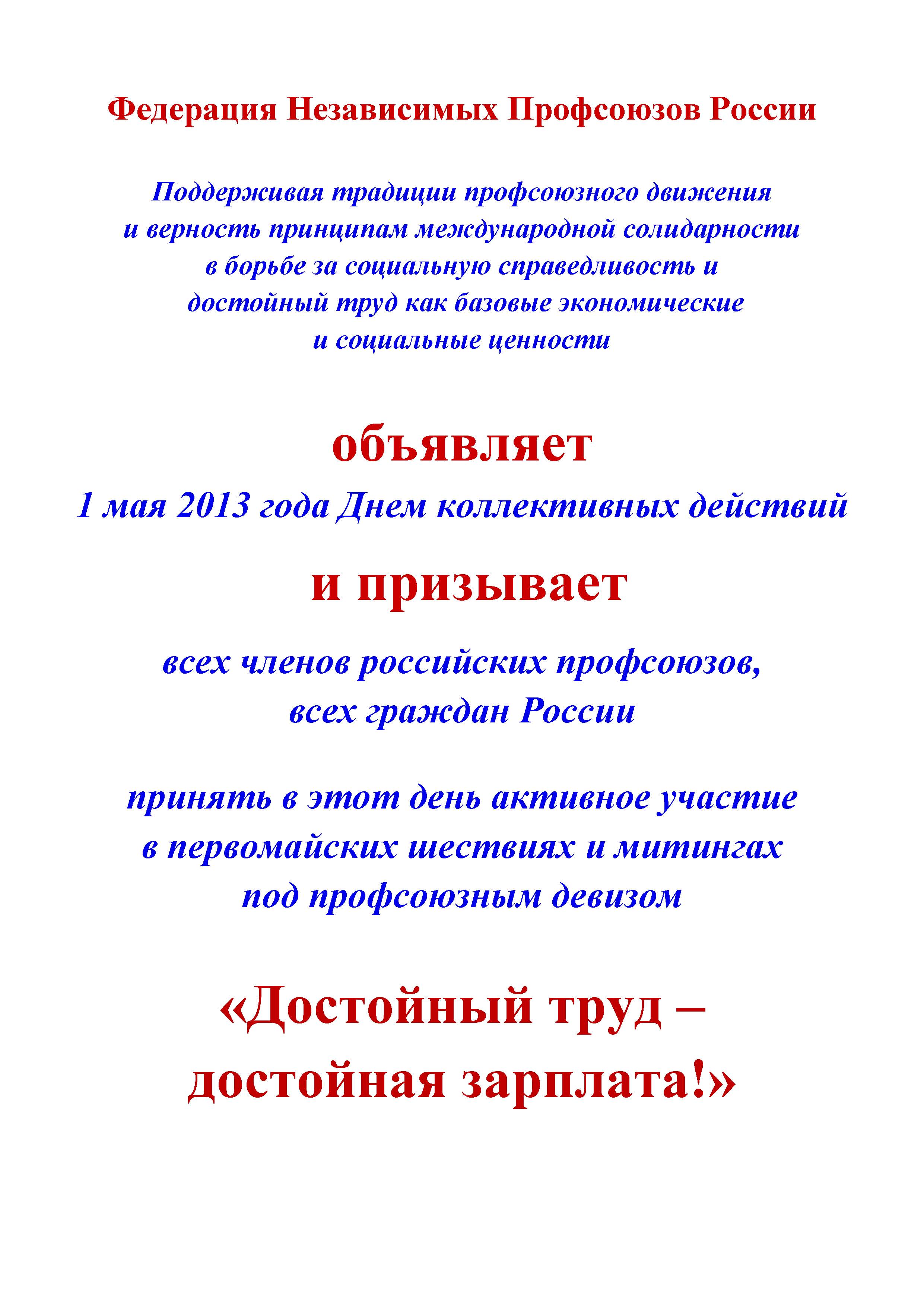 1. 1 мая 2013 года провести акцию профсоюзов в форме шествий, митингов под девизом «Достойный труд - достойная зарплата!», рекомендовать для использования в ходе первомайских акций общие лозунги профсоюзов (приложение № 1), а также выдвинуть дополнительные лозунги, исходя из ситуации в регионах, с учетом требований членов профсоюзов.