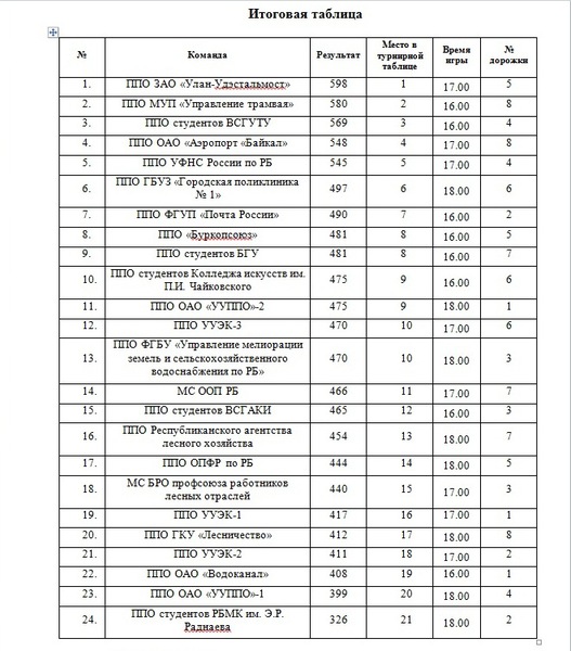 1 место - команда «Мост» (ППО ЗАО «УланУдэСтальмост») с результатом 598 очков;