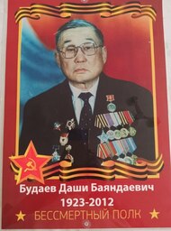 Наш Дед - Будаев Даши Баяндаевич родился в 1923 году в селе Алцак Джидинского района. Когда началась Великая Отечественная война юный Даши, как и многие молодые люди, комсомольцы откликнулся на набатный призыв Родины и добровольно пошел в ряды Красной Армии. После интенсивного обучения в школе воздушных десантников на Дальнем Востоке в Хабаровске курсанты влились в сибирские дивизии, направляемые в самое пекло войны на защиту Сталинграда. Вскоре, в числе 26 бойцов был дислоцирован далеко в тыл врага под Воронежем. По воспоминаниям Даши Баяндаевича, прыгали ночью с парашютами под обстрелом фашистов. Задача перед ними стояла минировать дороги, уничтожать боеприпасы, спускать под откосы эшелоны с немецкими солдатами, чтобы их как меньше прошло к подступам Сталинграда. В 1942 году вышел приказ Верховного Главнокомандующего И.В.Сталина «Ни шагу назад!». В те же дни снайпер Зайцев бросил знаменитый призыв «За Волгой для нас нет земли, отступать некуда, за нами – Родина!» Линия обороны Сталинграда была растянута на сотни километров. В битве с нашей стороны участвовало более миллиона человек. Шли жесточайшие бои, бились за каждую улицу, за каждый дом. Погибли сотни тысяч советских солдат и офицеров. А потери немецко-фашистских войск превысили полтора миллиона человек, в плен были взяты сотни тысяч вражеских солдат и офицеров, в том числе фельдмаршал Паулюс.