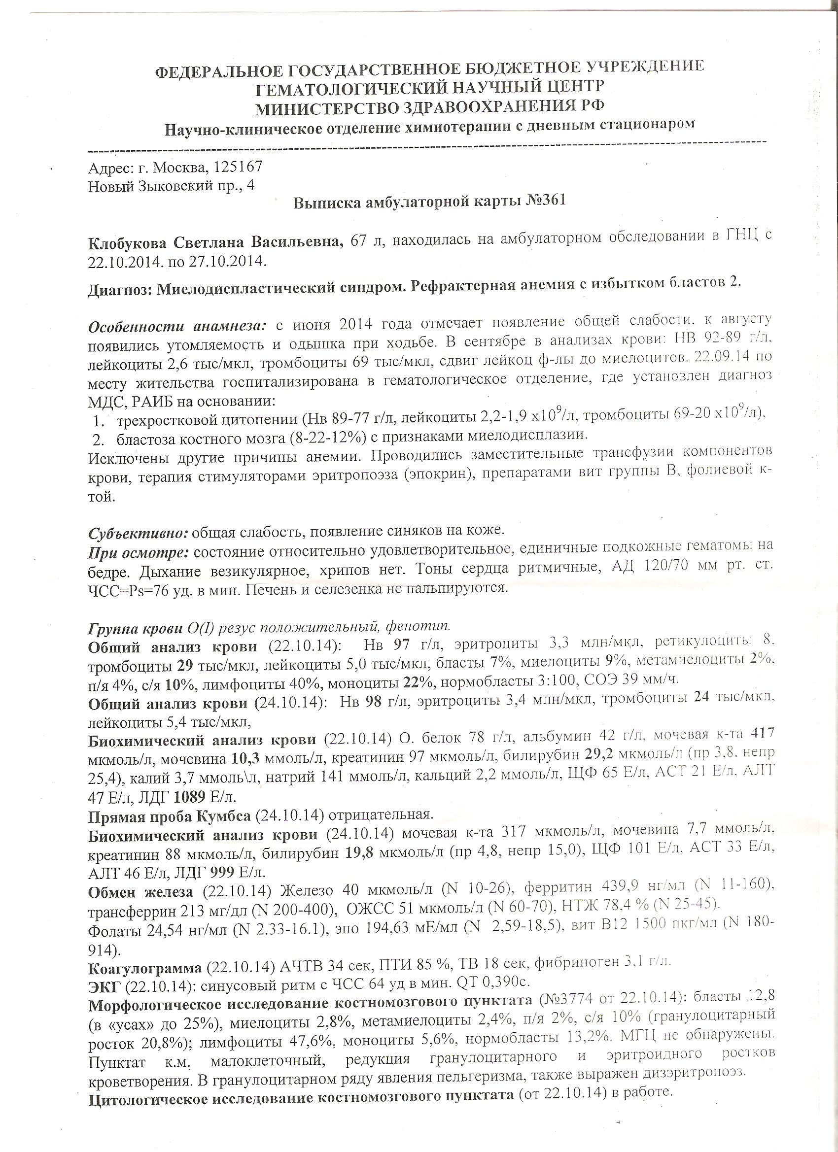 В связи с быстротекущим характером заболевания Светлане Васильевне срочно требуется для лечения дорогостоящий лекарственный препарат: 5-азацитидина. Стоимость препарата на курс лечения составляет 600 000 (шестьсот тысяч) рублей.