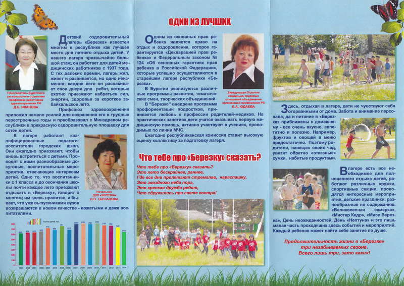 Бурятская республиканская организация профсоюза работников здравоохранения РФ реализует путевки в Детский оздоровительный лагерь «Березка» (п. Ильинка, Прибайкальский р-н). Полная стоимость путевки 13300 рублей.